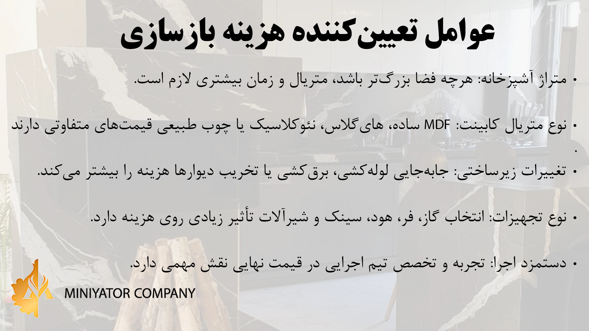 - متراژ آشپزخانه: هرچه فضا بزرگتر باشد، متریال و زمان بیشتری لازم است.