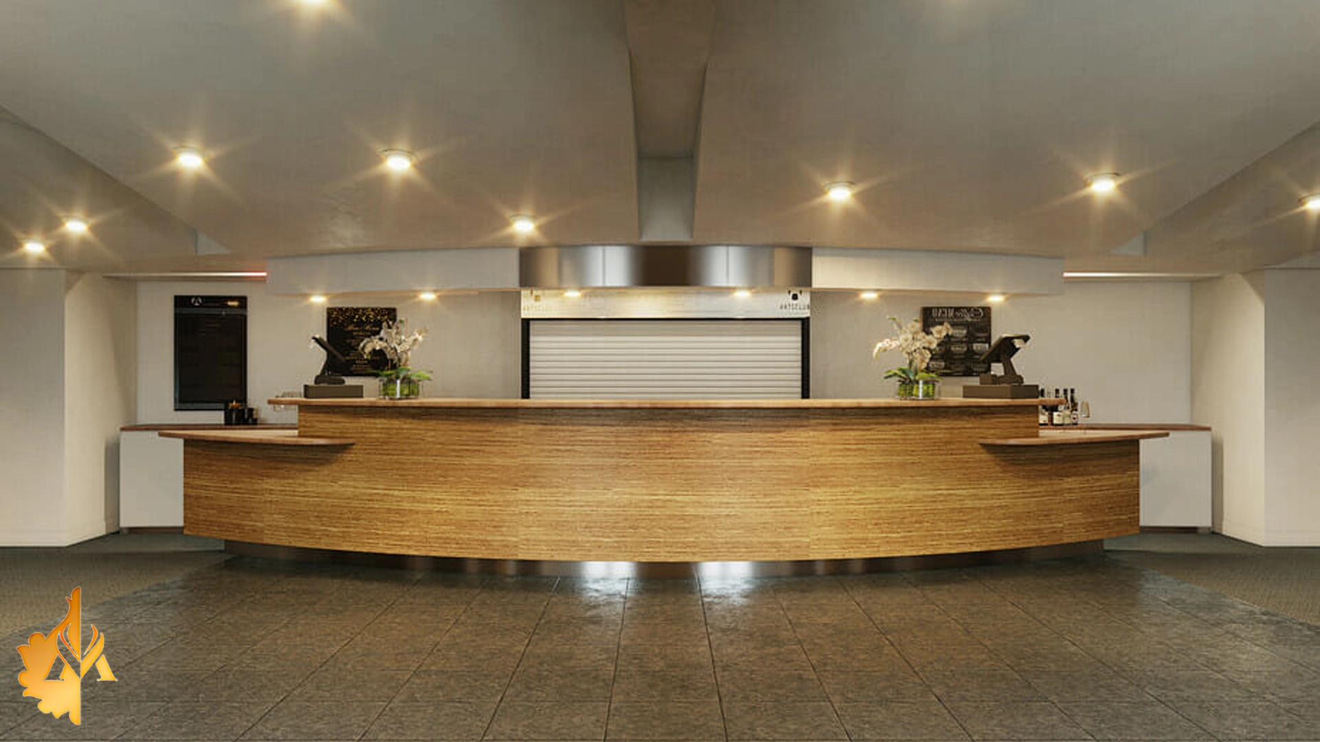 سقف در این لابی نقش مهمی در تعریف ریتم فضایی دارد. خطوط ساده و نورپردازی خطی، حرکت چشم را هدایت میکنند و انسجام کلی فضا را تقویت مینمایند. سقف نه سنگین است و نه تزئینی؛ حضوری آرام دارد که فضا را جمع میکند. این طراحی سقف باعث شده لابی احساس انسجام داشته باشد و عناصر مختلف آن بهصورت یک کل واحد درک شوند.