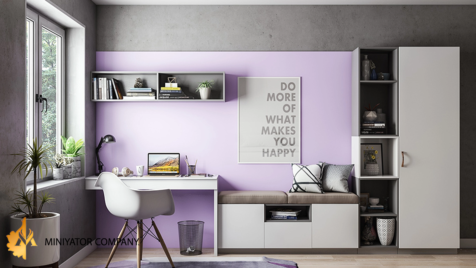 بنفش ملایم هم آرامش دارد و هم خلاقیت را تحریک میکند. همراهی آن با خاکستری روشن فضایی دلنشین، آرام و مناسب مطالعه طولانی به وجود میآورد.
